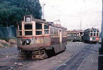 Built in 1913, retired in c.1952 it lasted some 20 years longer than most of its companion stepless cars. The view portrayed was in the car sidings beside the WACA ground in East Perth in 1952. The tram had been modified in the late 1940's, including the fitting of the centrally-mounted destination box, removal of the external motorman's door and replacement with an internal door cut into the bulkhead (forcing the motorman to climb over an adjoining passenger seat!)