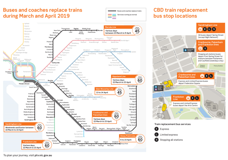 Pakenham and Cranbourne lines: Various days between 22 March and 23 April, adding 60 min.