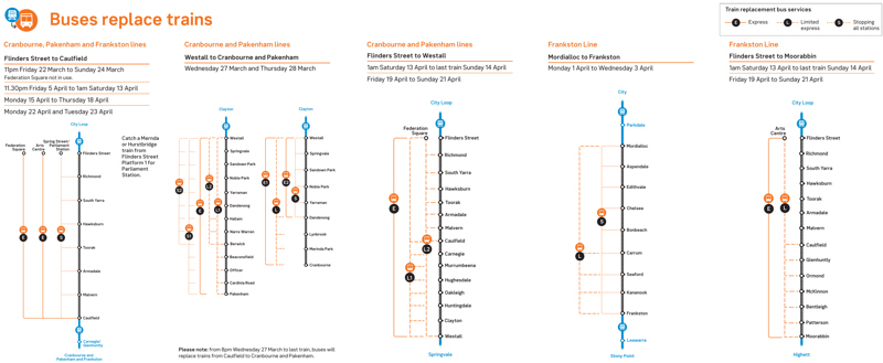 Pakenham, Cranbourne, and Frankston lines Stopping-all-stations buses depart from Spring St for stations between Parliament and Caulfield (weekdays only).