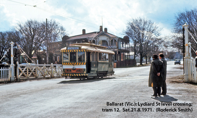 710821Sa Lydiard St level crossing (Ballarat, Vic.): Tram 12. (Roderick Smith).