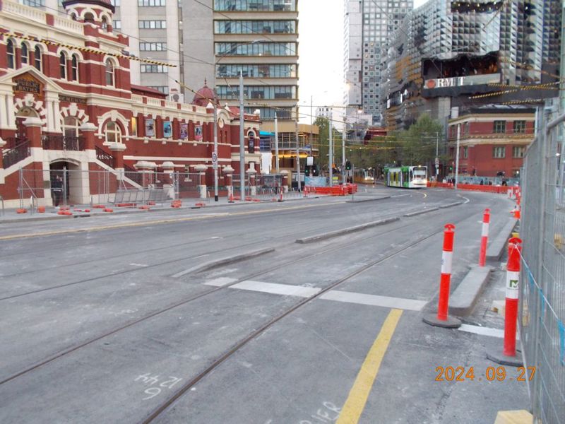 The 'B' photo (also looking south) shows three tracks at the start of Swanston St North. The nearest track goes around the corner into Victoria St, behind me as I took the photo.