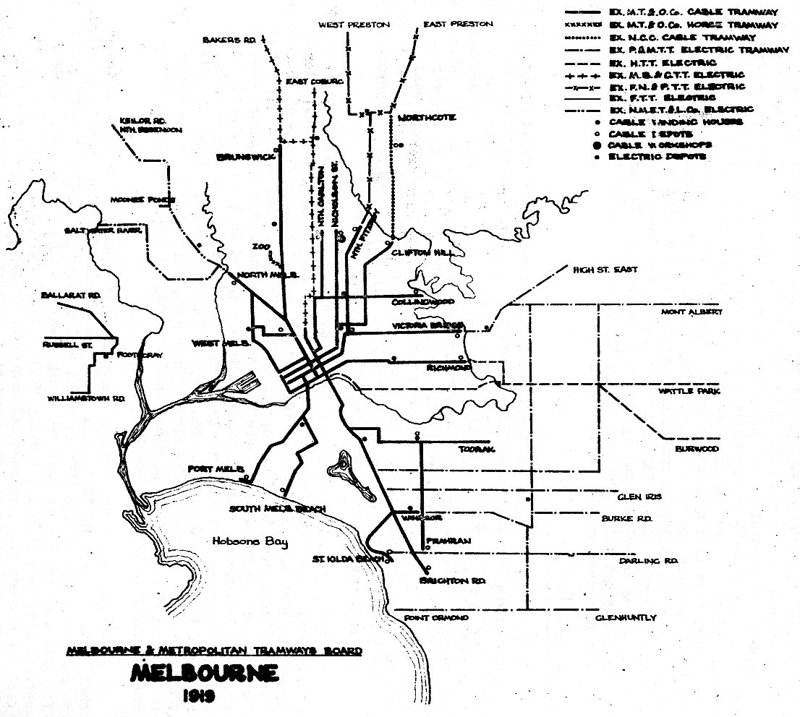 Does there exist a map of Melbourn tramway cablealignments through the years,
